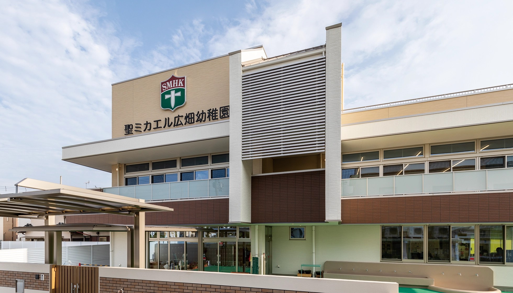 閑静な住宅街の一角に建つ聖ミカエル広畑幼稚園は、園内に教会がある認定こども園です。1965年の開園から、キリスト教の精神に基づいた保育・教育活動を通じて、地域に親しまれてきました。そして創立55周年を機に、老朽化した園舎を、鉄骨造・3階建の耐火建築物に建て替えることになり、窯業系サイディングの光セラと、KMEW耐火シートをご採用いただきました。