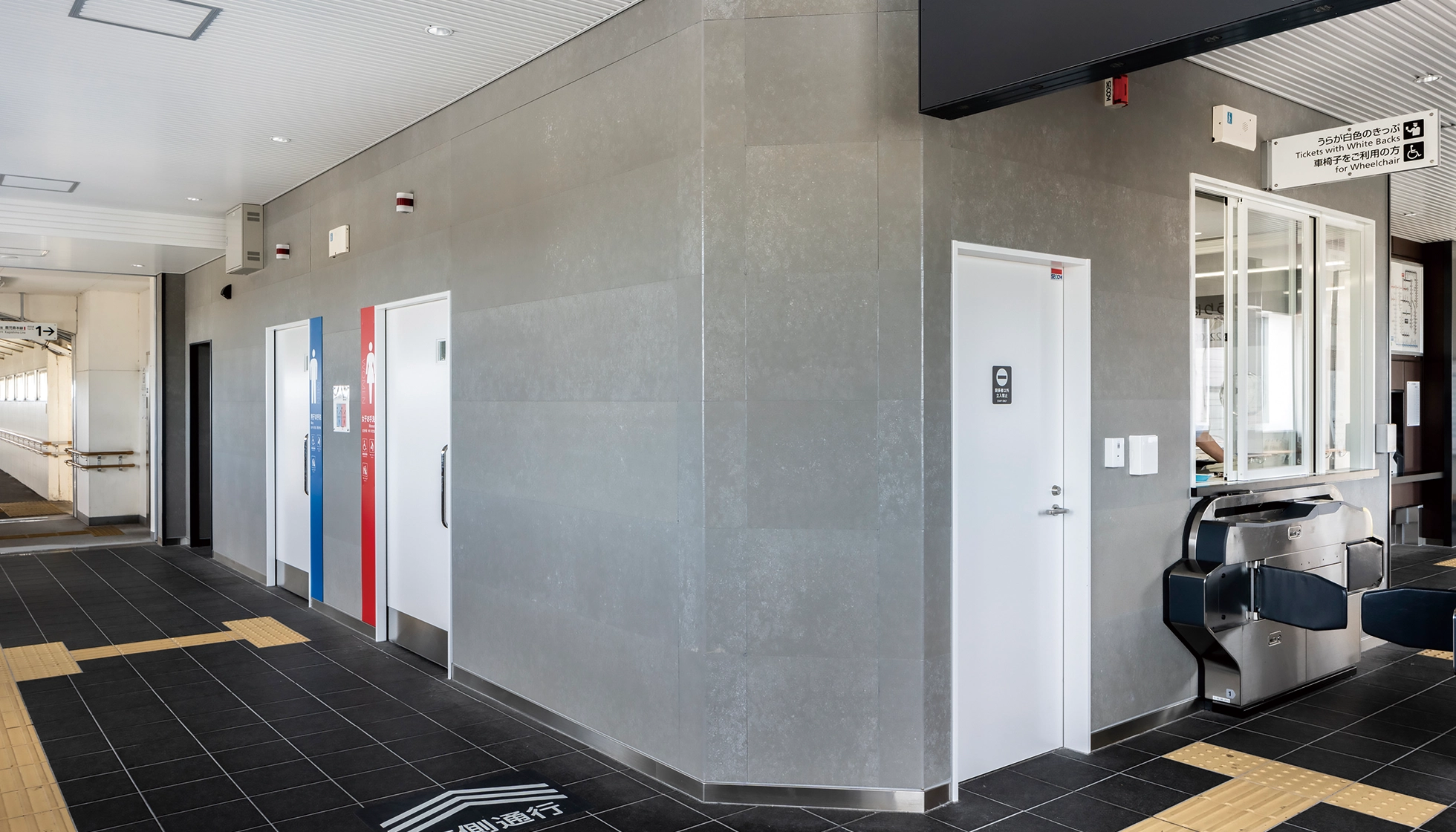 「駅は休むことなく動きつづけるので、メンテナンスが難しい。建材選びの第一条件は強さ≠ノなり、押出成型板がまず候補にあがります。」と岡田氏。しかし窯業系サイディングもJISに準じて曲げ破壊強度や遮音性・断熱性などの確認がとれており、色柄も多彩であることから、窯業系サイディングを使うケースが増えているとのこと。また、駅構内に使われているSOLIDOは、1枚1枚、エフロ※の出方が異なり、素材感のあるところが気に入られて、ご採用いただきました。SOLIDOをベースに、メラミン化粧板をアクセント使いすることで、デザインが単調にならないよう配慮し、通勤・通学の方に喜んでいただける内装に仕上げられています。