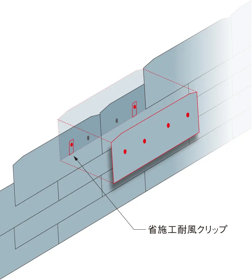 | 省施工 | 耐風クリップを使用することで、製品をクリップに仮置きし、施工できるので、製品の位置決めや支えがしやすく、省施工が図れる。