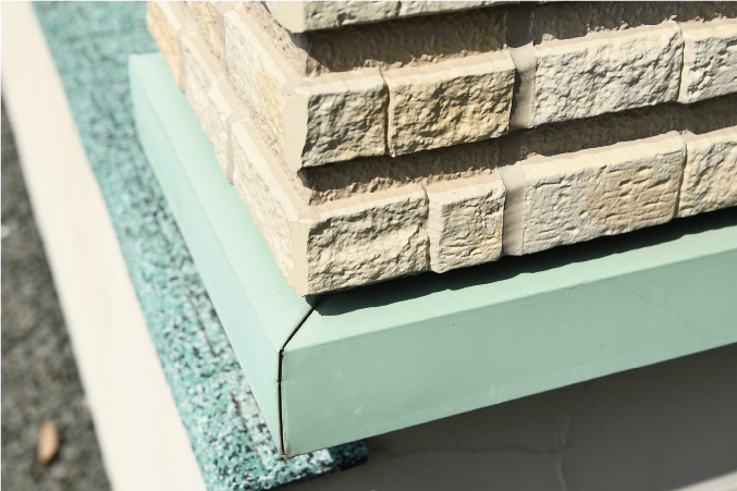 紫外線による色あせに強い光セラ。ミント色の土台水切りと比べてみると、耐候性の差が見てとれます。