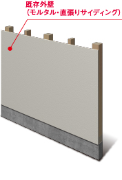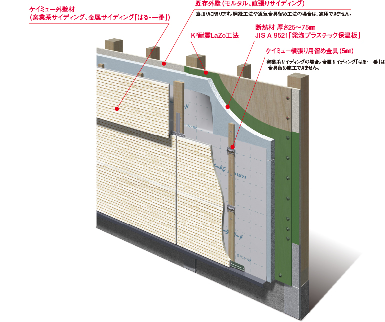 既存外壁に耐震補強工事を行った後、断熱材を施工し、ケイミュー外壁材を重ね張りする工法です。