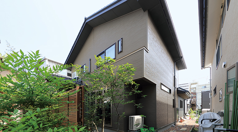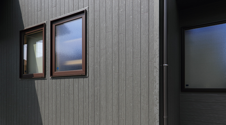 築23年を迎えた住まいの外壁リフォームを考えられていたM様。いくつかの外壁の候補があったなかで、はる・一番は金属サイディングなのに落ち着いた色柄のバリエーションが多いことや、全ての柄が遮熱性フッ素焼き付け塗装で日焼けによる色あせがしにくいため、仕様を気にすることなく好みの色柄を選べることに興味をひかれました。見る角度により表情を変える流刻柄と、陰影が印象的な和木目柄による重ね張りにより、断熱の機能性と落ち着いた美しさを兼ね備えた外観に仕上がっています。