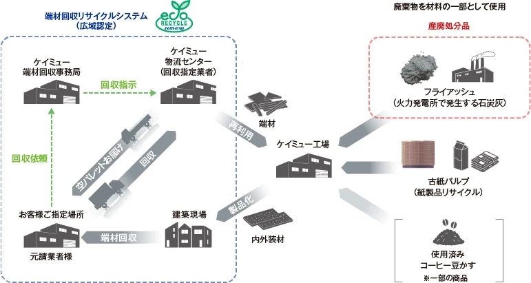 窯業系内外装材の製造にあたり、セメントにフライアッシュ(石炭灰)、新築現場で発生する 自社建材の端材、古紙パルプおよびコーヒーショップから出る使用済みの豆かす(一部の商品で使用)などを混合した材料での商品化に成功。 継続的なリサイクルと環境負荷低減を可能にしています。