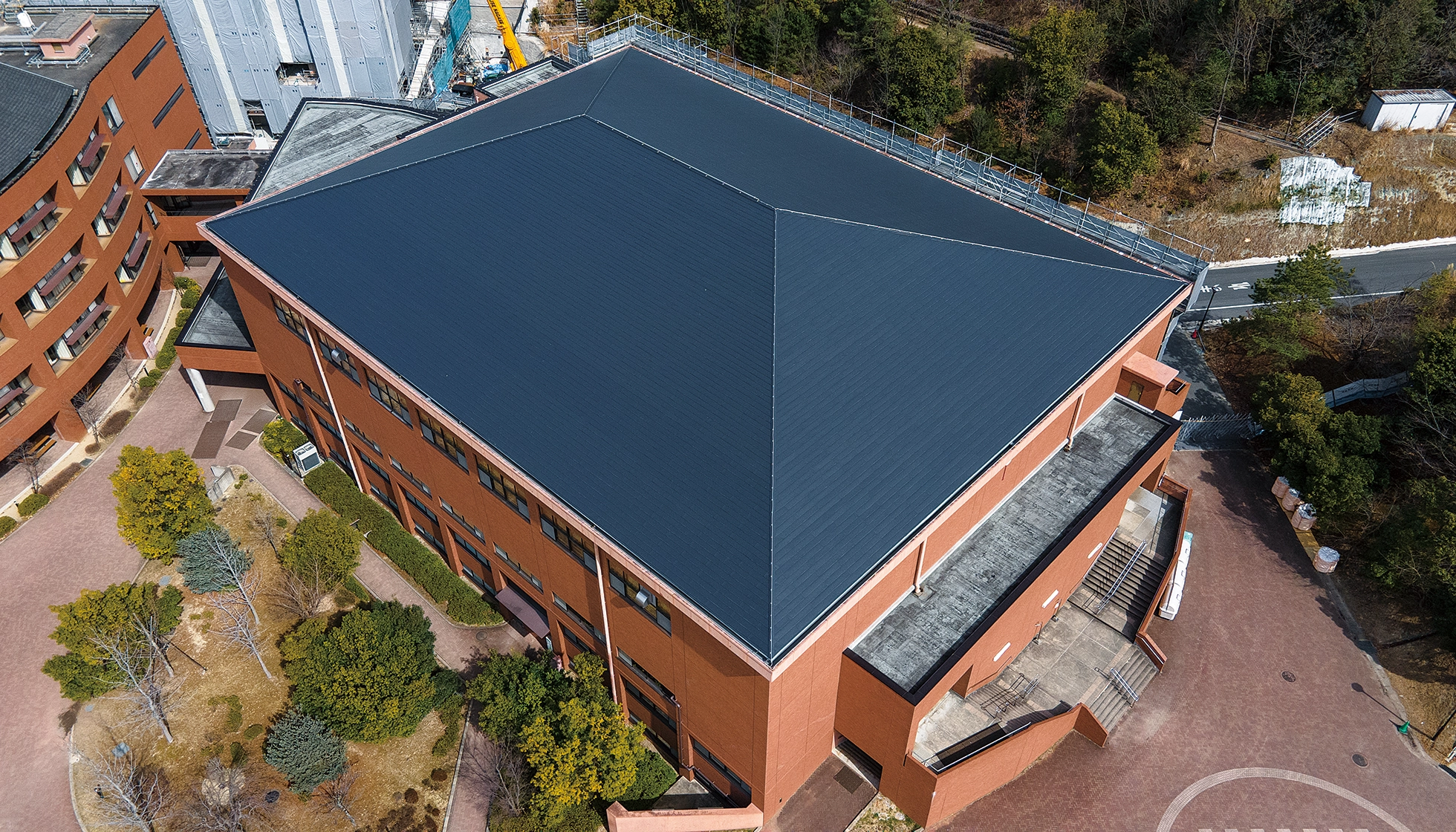 「スマートメタル」を重ね葺いた体育館は、高尾氏の意図した通りの仕上がりで、校舎のカラーベストの屋根と自然な感じで調和しています。また優れた耐食性をもち錆などの影響を受けにくく、省メンテナンスでランニングコストを抑えられるのも、「スマートメタル」ならではのメリットと高い評価をいただきました。立命館様からも、美しさを取り戻した体育館で卒業式を迎えることができ、さらに工事中は騒音や振動、ホコリに悩まされることなく、体育の授業やクラブ活動が続けられたと、大変喜んでいただけそうです。