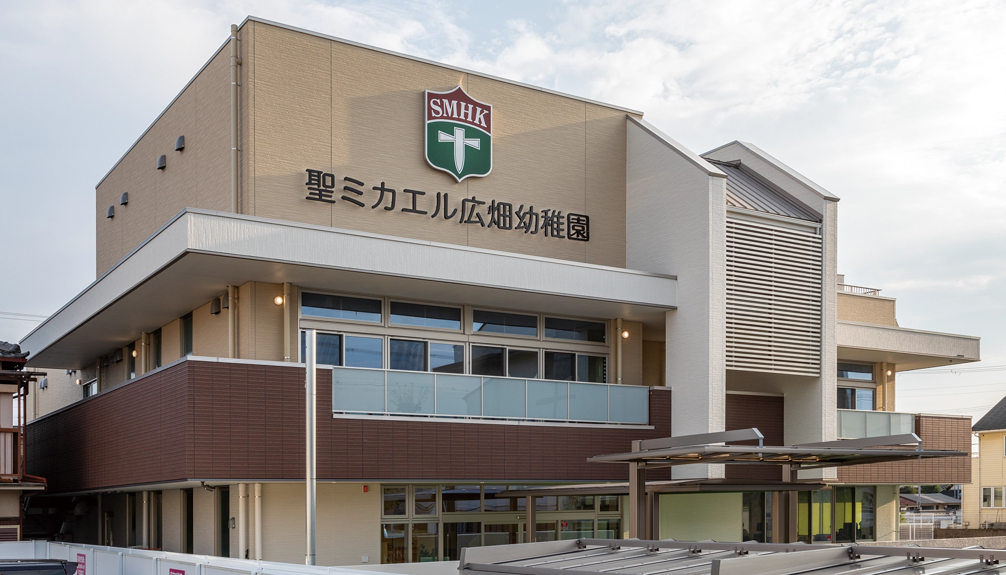 閑静な住宅街の一角に建つ聖ミカエル広畑幼稚園は、園内に教会がある認定こども園です。1965年の開園から、キリスト教の精神に基づいた保育・教育活動を通じて、地域に親しまれてきました。そして創立55周年を機に、老朽化した園舎を、鉄骨造・3階建の耐火建築物に建て替えることになり、窯業系サイディングの光セラと、KMEW耐火シートをご採用いただきました。