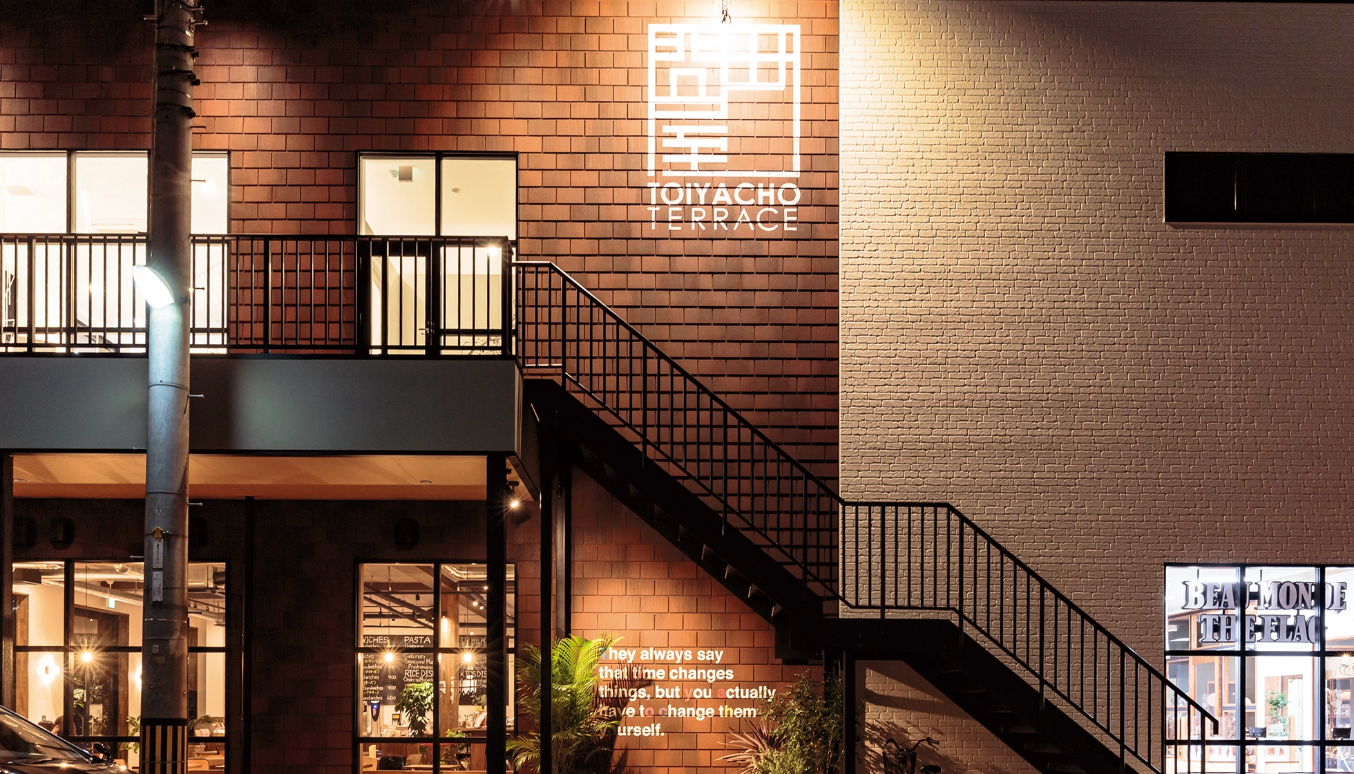 かつての繊維の街、岡山市問屋町。今ではカフェやセレクトショップなど若い世代に人気のある街ですが、その中心に残された広大なイベント用地を再生。商業店舗棟と9棟の住宅展示場から構成される複合施設「問屋町テラス」としてオープンしました。施設全体の計画を手掛けた板倉氏は、問屋町の倉庫が建ち並ぶ風景からファッションとアートの街として再生したニューヨーク市ブルックリンを想起。どこか懐かしく、それでいて洗練された施設のイメージを固めていかれたそうです。