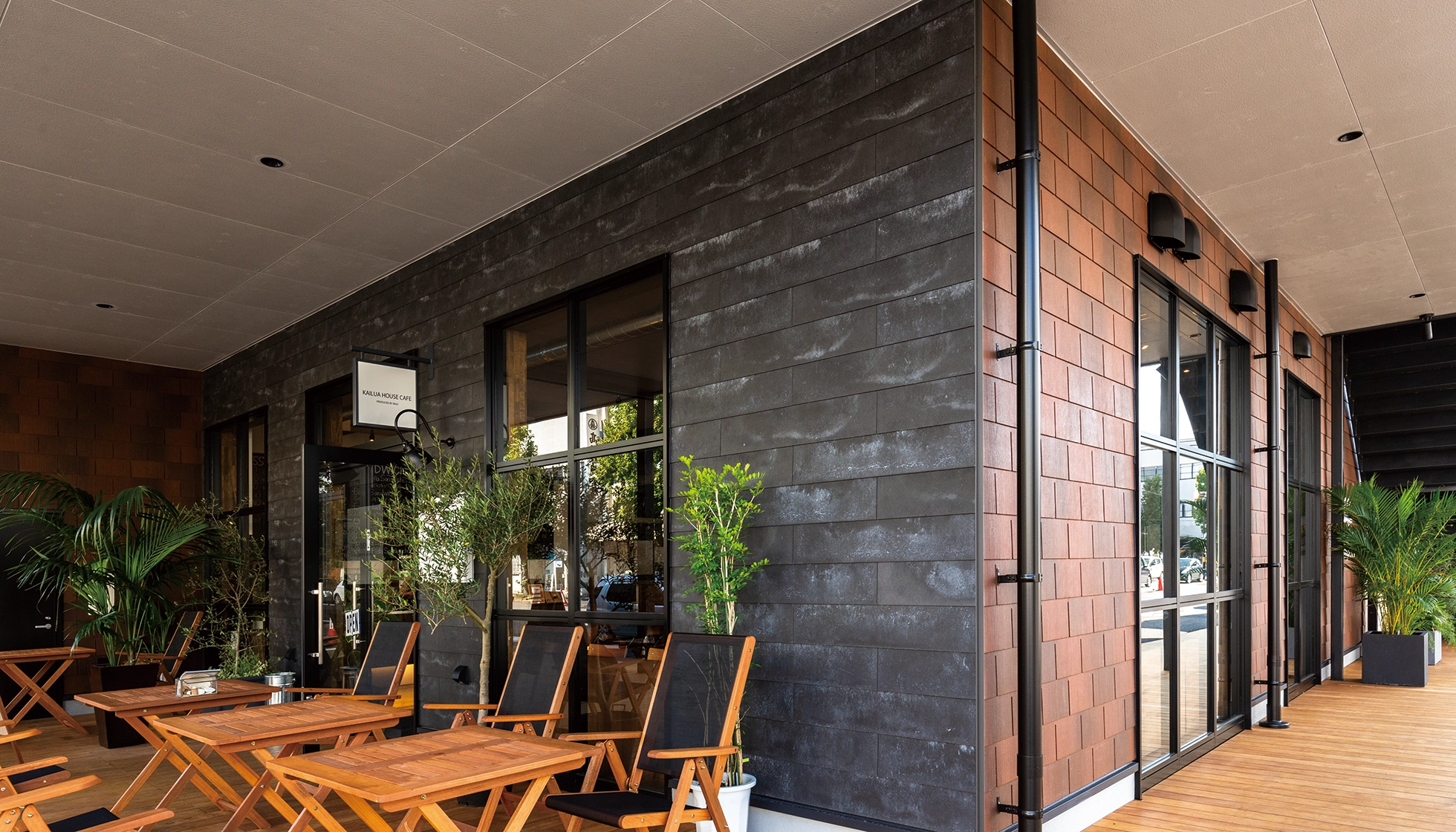 インダストリアルな町並みをイメージし、レンガ造りの倉庫のようなプランニングを行っていた板倉氏。レンガ調のみだと単調になりすぎると考え、ブリックタイルやウッドなどの色々なマテリアルを使用した動きのあるデザインを検討されました。そのイメージをケイミューに伝えた際に提案されたのが、カラーベストを外壁材として使うCBウォール工法と、窯業系サイディングの組み合わせでした。カラーベストのマットな質感やナチュラルなグラデーションがレンガに替わる「素材感」を持っていたことが採用の決め手となりました。屋根材を外壁として使用するのは初めてでしたので、実際に施工している愛媛県まで足を運んで仕上がりを確かめ、やはりこれしかないと自信を深められました。