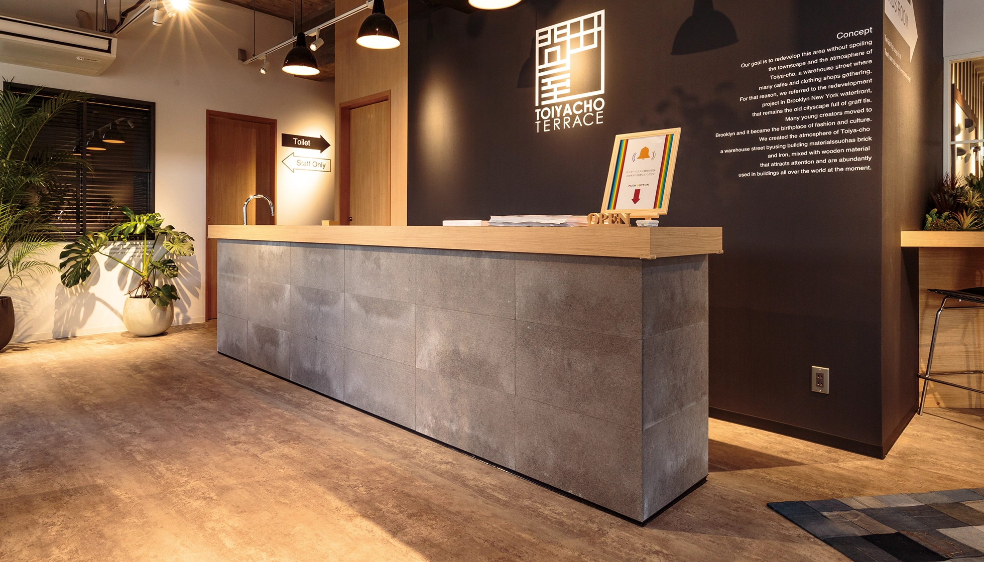 内装材に造詣の深い板倉氏がひと目で気に入ったのがSOLIDOでした。「1枚1枚の柄が異なり、動きがあって面白い」と、施設内の内壁やカウンターにはtypeFやtypeMセメント、外壁には引き締まったtypeM鉄黒を選定されました。そして実際に施工してみると、セメント素材独特の白華により狙い通りの動きがある表情が生まれ、好評を博したと満足していただけました。