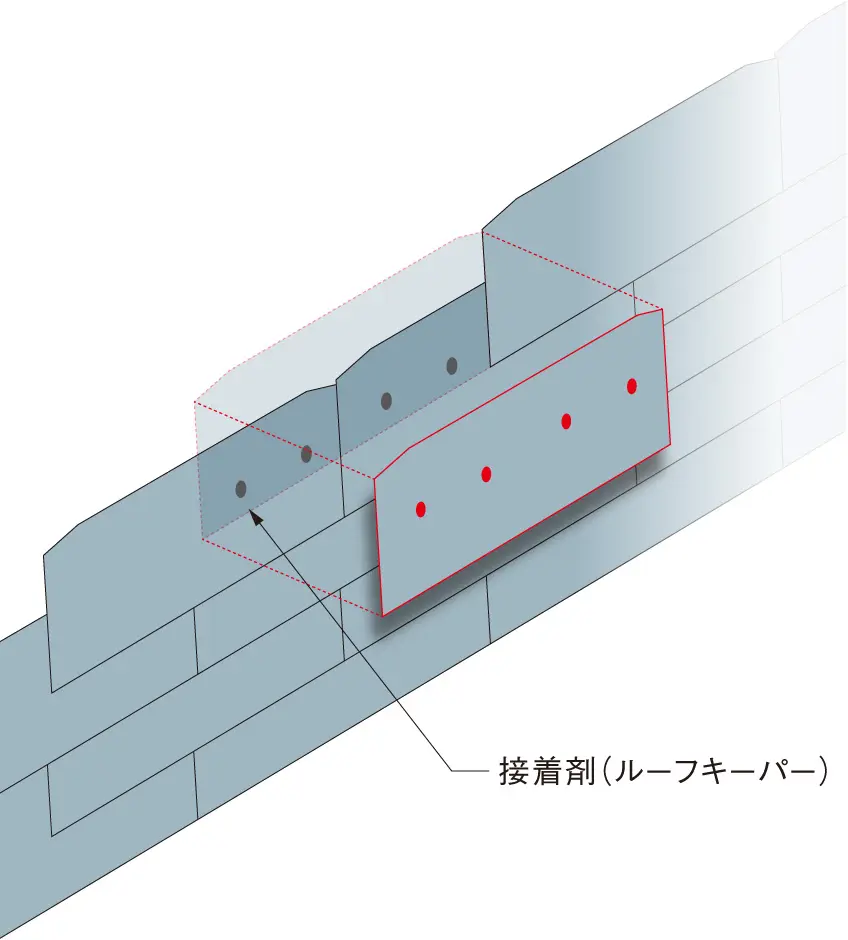 外装材の施工は通常通りの釘(ビス)留めに加えて接着剤(ルーフキーパー)を併用して留付け、張り上げます。
