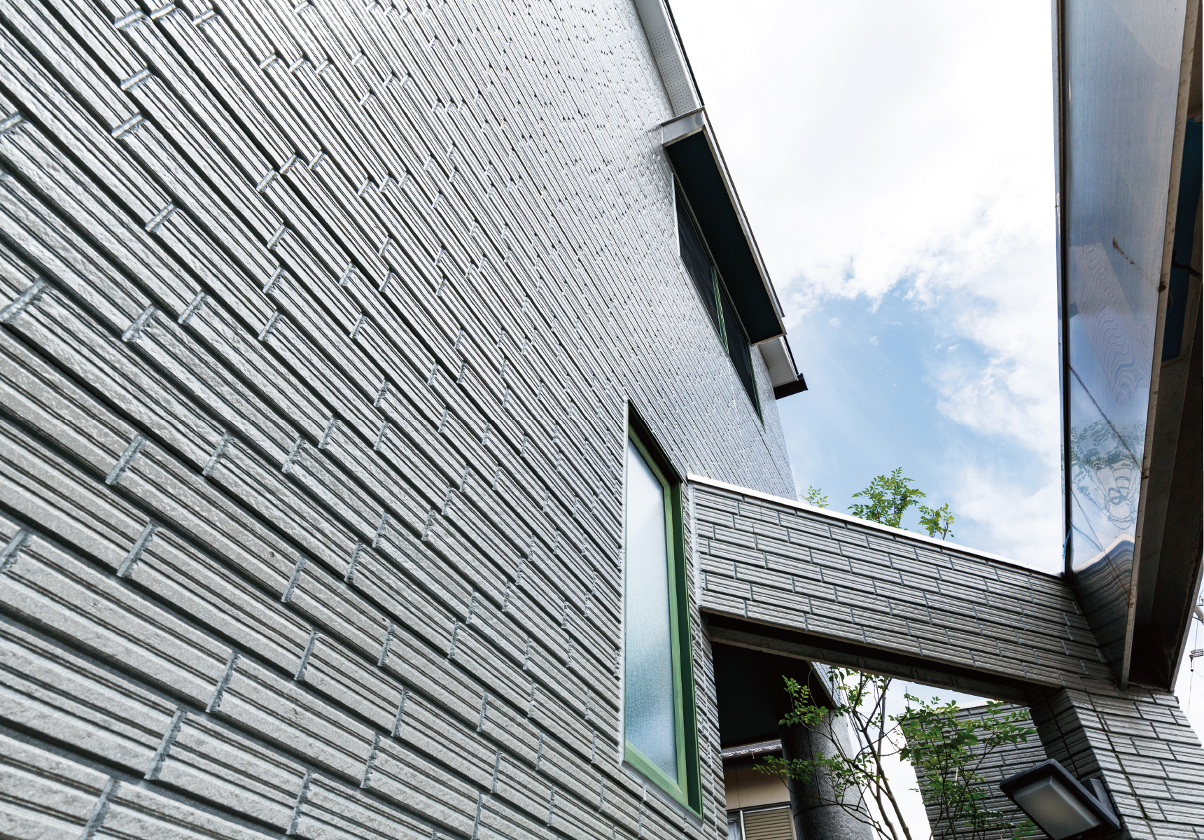 お施主様こだわりのグリーンのサッシに合わせたグレーのタイル柄が印象的。24年経っても、その風合いを保っており、立派な外観をイメージ付けています。