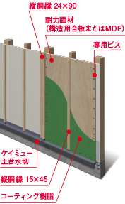 既存外壁に耐震補強工事を行なった後、ケイミュー外壁材を重ね張りする工法です。