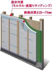 既存外壁に耐震補強工事を行った後、断熱材を施工し、ケイミュー外壁材を重ね張りする工法です。