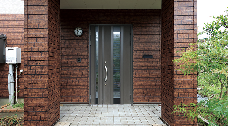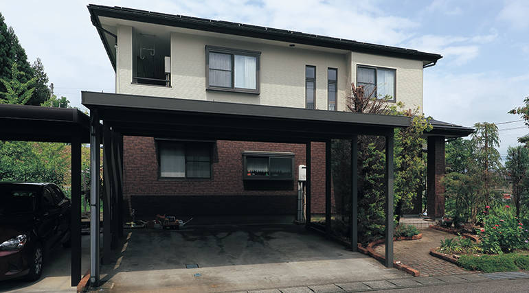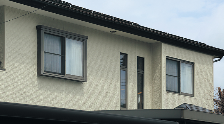 長年の風雪による外壁の色あせや傷みが気になっていたT様。リフォーム会社様に相談し、様々な外壁のコーディネートを提案されたなかで、はる・一番煉石柄Vの落ち着きと重厚感のあるデザインを気に入られました。1F外壁にブラウン系の煉石柄Vを、2F外壁にナチュラルアイボリーの斜石柄を張り分けることで、ハイコントラストな外観に仕上げています。はる・一番を重ね張りすることで、断熱効果が得られ、室内の快適性も高められています。
