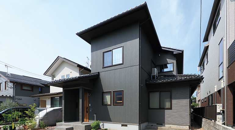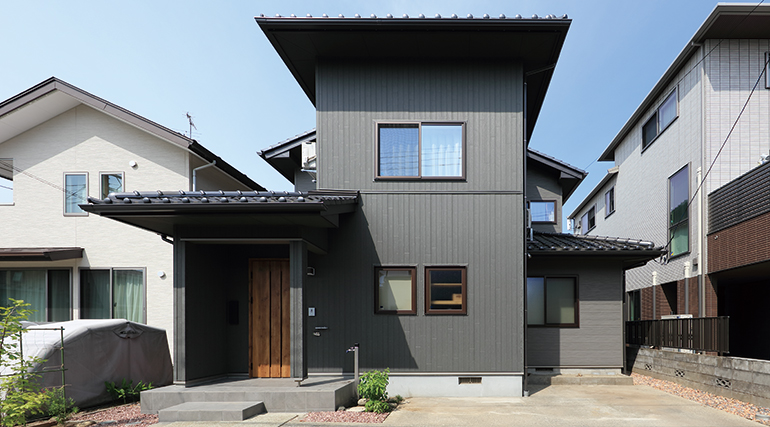 築23年を迎えた住まいの外壁リフォームを考えられていたM様。いくつかの外壁の候補があったなかで、はる・一番は金属サイディングなのに落ち着いた色柄のバリエーションが多いことや、全ての柄が遮熱性フッ素焼き付け塗装で日焼けによる色あせがしにくいため、仕様を気にすることなく好みの色柄を選べることに興味をひかれました。見る角度により表情を変える流刻柄と、陰影が印象的な和木目柄による重ね張りにより、断熱の機能性と落ち着いた美しさを兼ね備えた外観に仕上がっています。